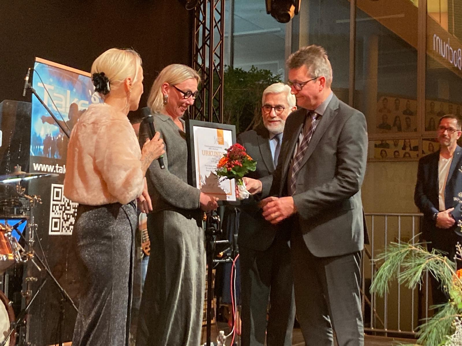 Prof. Dr. Ulrike Schara-Schmidt (2. von l.) nahm stellvertretend für die Co-Koordinatoren Dr. Andreas Ziegler aus Heidelberg, und Prof. Dr. Janbernd Kirschner aus Freiburg, den Forschungspreis der Deutschen Duchenne Stiftung entgegen.